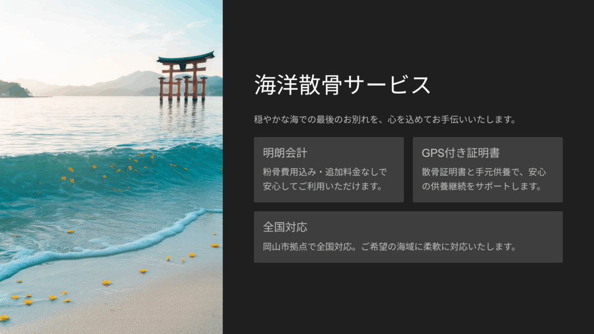 ✅岡山市在住の方がよく心配されるのは「地元からでもちゃんと対応してもらえるの?」という点ですが、ここは心配いりません。最寄りの港からの出航や、遺骨の郵送サポートなど、柔軟に対応してくれます。