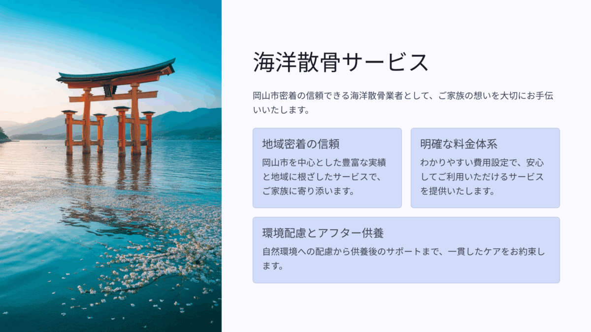 また、散骨後には散骨証明書が発行されるので、後から「どこで供養したのか」を振り返れるのも安心材料。岡山市に住む方にとって、地元の海とつながるような供養ができるのは心強いですね。