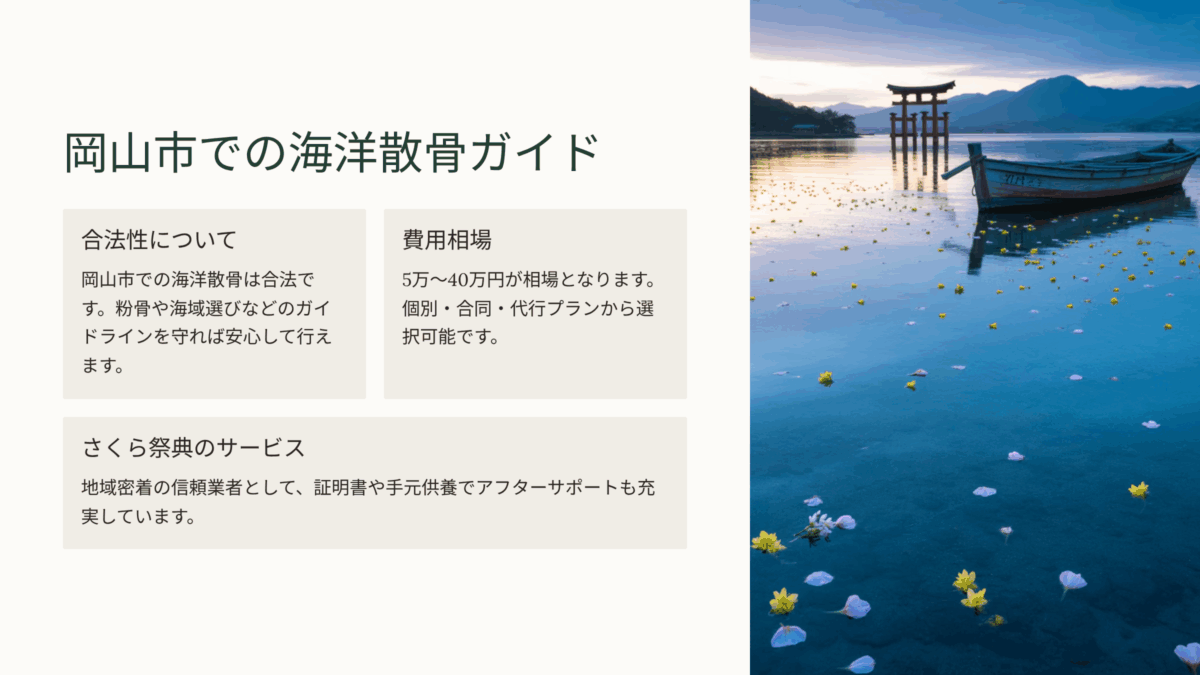 岡山市で安心できる散骨業者を探している方は、さくら祭典の詳細をこちらでご確認ください。
