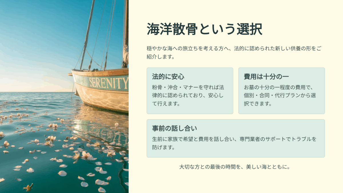 👉 基礎からわかりやすくまとまったプランは、海洋散骨サービスのご案内で確認できます。