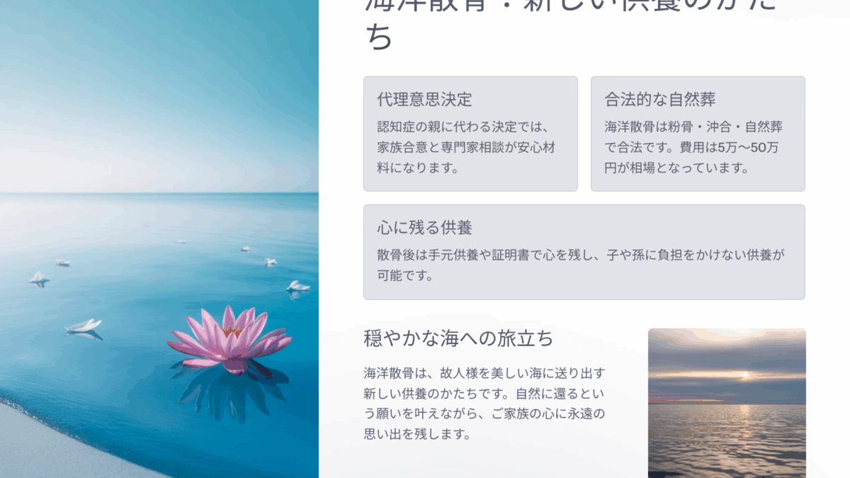 「お墓を残すより自然に還りたい」と願う方が増えています。特に認知症の親御さんを持つご家族にとっては、将来の維持負担を考えると海洋散骨は大切な選択肢のひとつです。この章では、海洋散骨の基本と合法性、そして注目を集める社会背景をわかりやすく解説します。